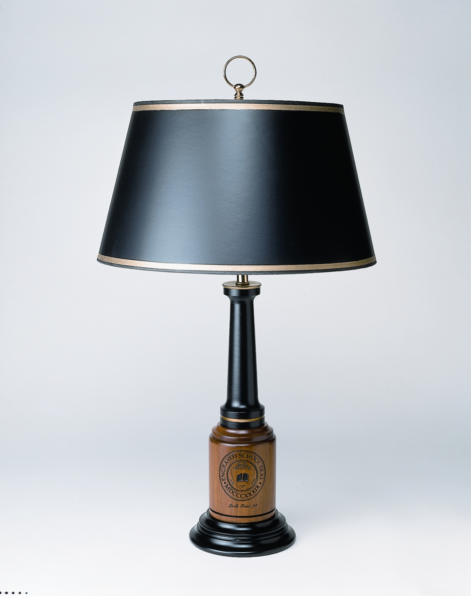 This classic lamp is handcrafted in Massachusetts with solid maple hardwood, hand painted with gold beading, and laser engraved with the Fairbanks family crest. It has a two-way setting for dimming, and a shade of black parchment. Dimensions: 27 inches H. The lamp can be personalized with up to three lines below the crest (up to 30 characters) at additional cost, and will be shipped directly to you. Shipping rates apply.